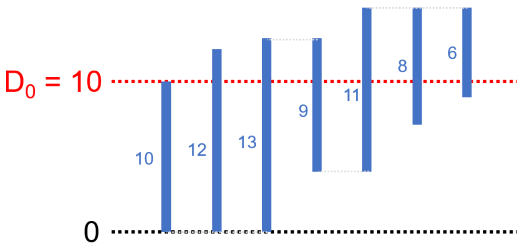 貪欲アルゴリズムの実行例の \(1\) つを図で表すと、以下のようになります。これは \(D = (10, 12, 13, 9, 11, 8, 6)\) の場合です。