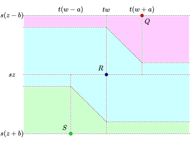 From the above, this problem can be solved in about \(O((N+Q)(\log N+\log Q))\) time. Although it is a bit tough because we need to accurately specify multiple regions, the implementation can be somewhat simplified by noting that the processing to be performed for the \([s(z-b),sz)\) part and the \([sz,s(z+b))\) part has the same form, among other things.